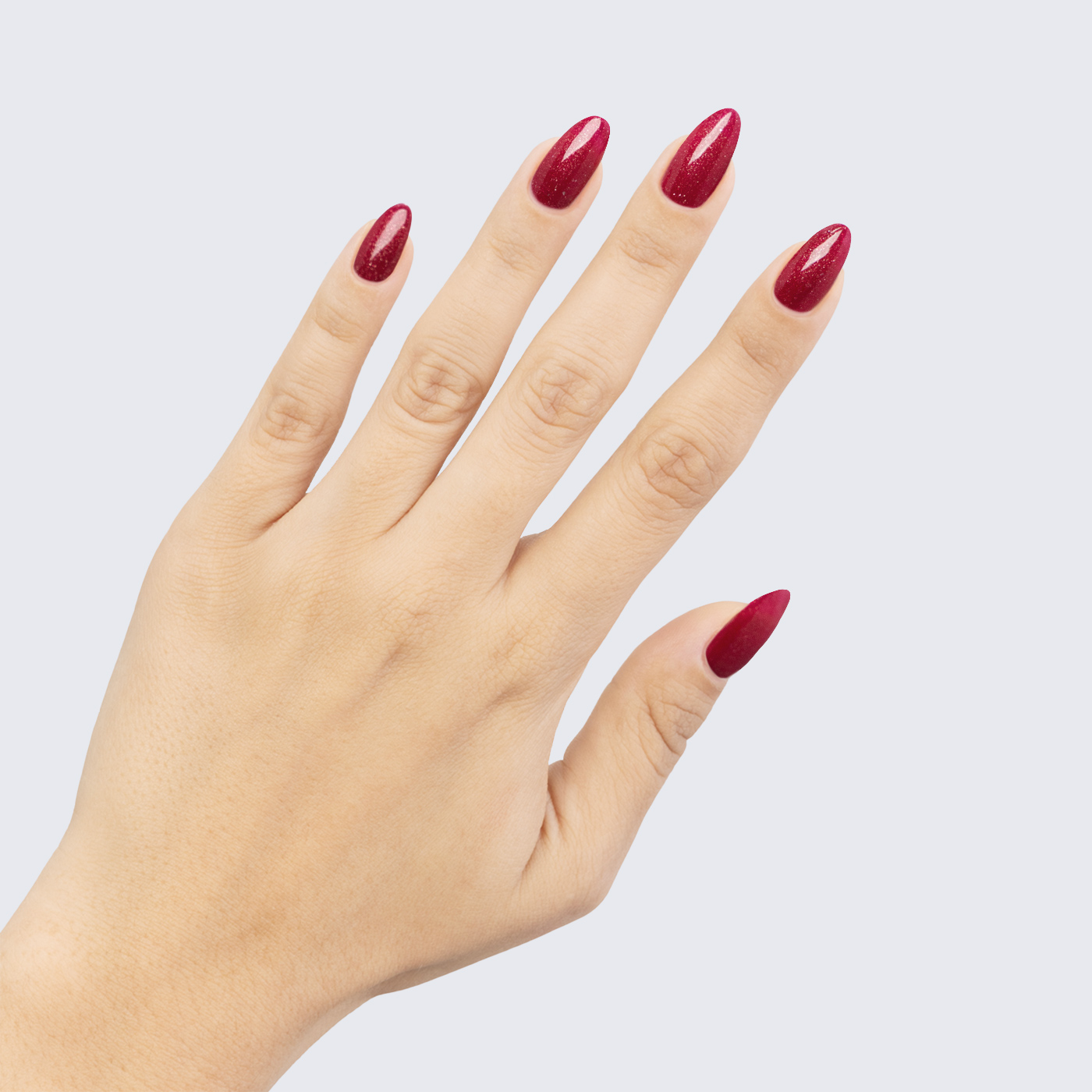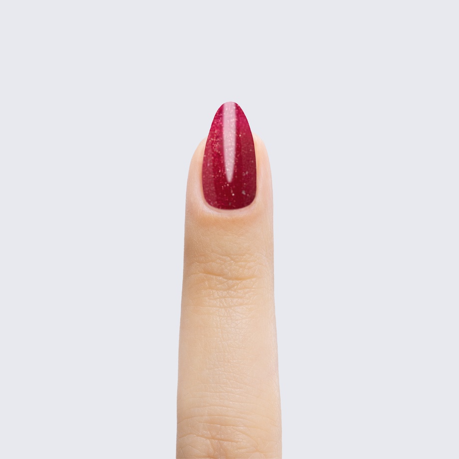 Wine red. Dark. Sparkles. Opaque. Warm undertone.
